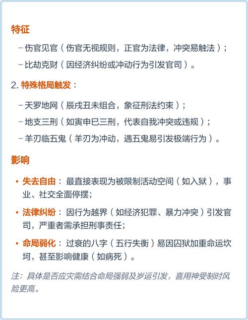 观察牢狱八字,并不是为了预言终结,而是为了寻找规避的可能性、如果一个命局中有“伤官见官”的基因,在择业时就应尽量远离金融、博彩等诱惑大、规则复杂的行业,转而从事艺术、技术等需要释放伤官才华的领域、如果命局中有“财坏印”的倾向,则应时刻警惕权力的寻租,加强法律知识的学习。