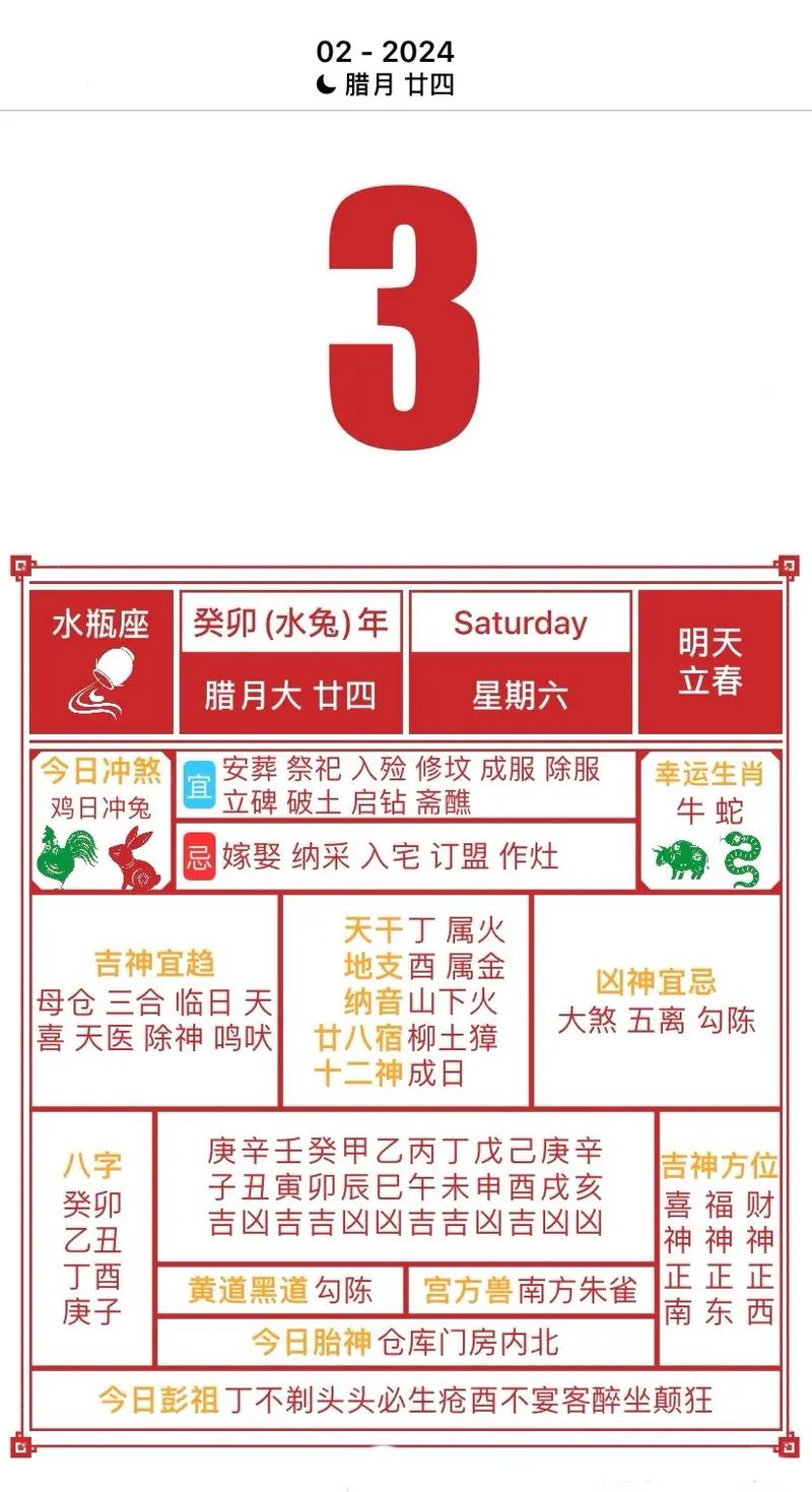 【冲煞】:此日冲鸡(辛酉),煞西、属鸡之人于此日应谨言慎行,避免做出重大决策、事涉西方,亦当回避。