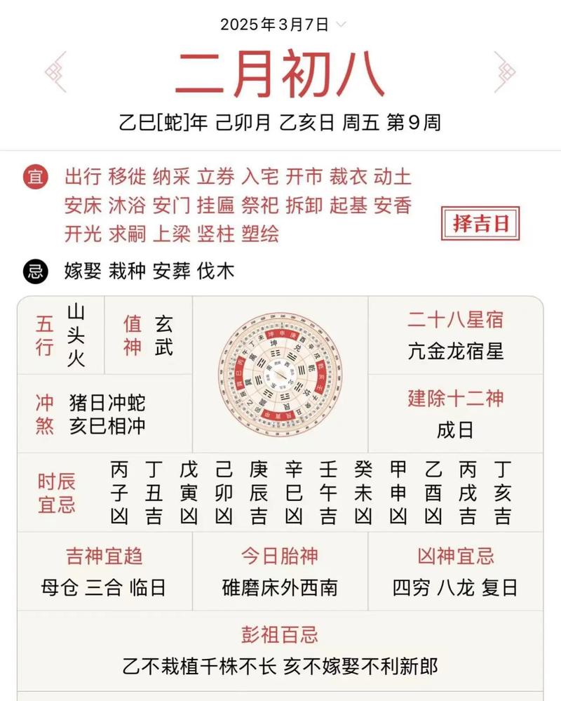 综合观之,2026年二月初八,辛卯之日,虽有金木交战之象,亦有松柏坚韧之质、得心宿吉星照临,大利婚嫁、祈福之事、然逢危日,又冲肖鸡,行事须审时度势,避开凶险方位,方能趋吉避凶,纳福迎祥。