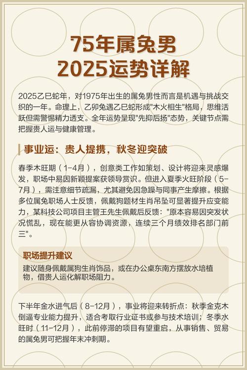 时维丙午马年,金秋十月、对于生于一九七五年的乙卯属兔人而言,此月乃是于纷繁变动中寻得喘息与转机的重要时刻、流年天干丙火与乙木相生,地支卯午相破,构成全年运势基调的矛盾与挑战、然十月步入戌土之月,卯戌六合,成火库之势,将此前诸多不利因素巧妙转化,犹如在崎岖山路中忽逢平坦大道,前路豁然开朗、知命而行,方能趋吉避凶。
