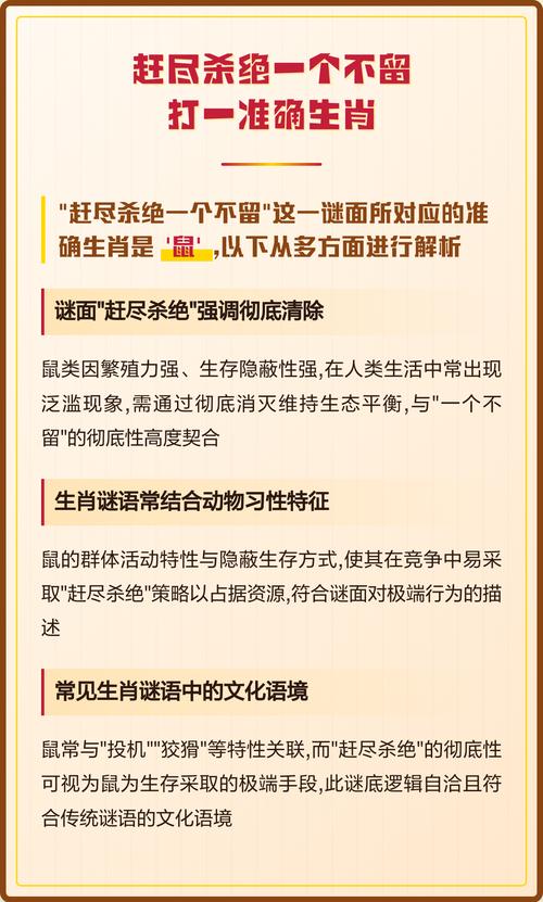 为何是猪?非虎非蛇?“赶尽杀绝”之精髓,在于一个“绝”字、绝者,终也,末也,尽头也、十二生肖,始于子鼠,终于亥猪、亥,位列地支之末,乃一轮循环之终点、杀至终末,赶至尽头,再无去路,此为“绝”,正应亥猪之位、此非言其性情残暴,而是取其在时辰序列与轮回周期中的“终结”之象、故此谜底,舍亥猪其谁?