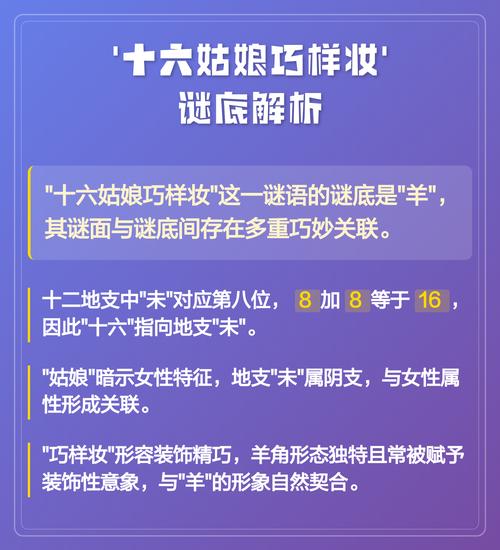 其一,为凑数与音韵之说、在许多民间谜语中,数字并非皆有实指,有时仅为使谜面读来上口、结构完整、如同“八个娃娃抬面鼓”,重点在“抬面鼓”而非“八个娃娃”、“十六”在此可能仅是为了构成一个“十六岁少女”的鲜活形象,豆蔻年华,正值爱美之时,与“巧样妆”的行为逻辑相符,增强了谜面的画面感。
