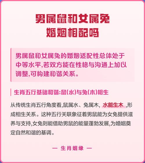 初识之时,鼠男的聪慧与幽默极易吸引兔女,而兔女的娴静与善良也能让鼠男感到前所未有的心安、水生木,从五行上看,鼠男对兔女有着天然的滋养与支持意愿、他愿意为她创造更好的生活条件,欣赏她的柔美、这种组合,看似是才子佳人,一个主外打拼,一个主内持家,有着明确的分工与互补性。