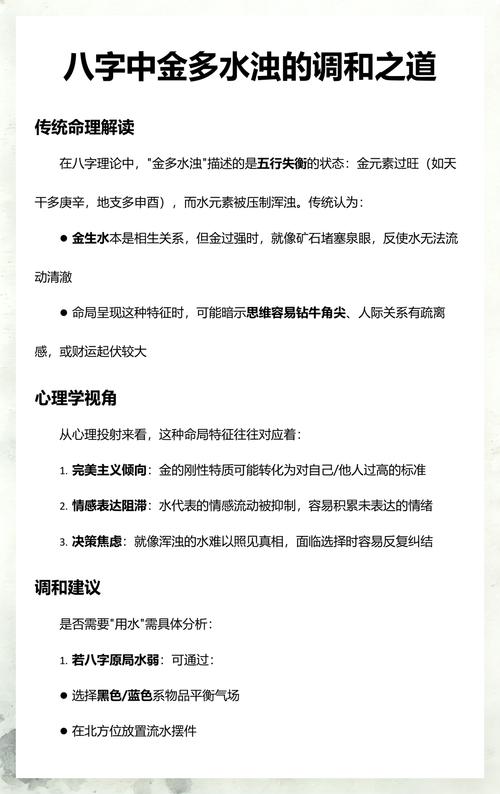 文章至此,关于金多水浊的论述已尽其详、从五行生克到性格演化,从事业流年到化解之道,命理的真谛不在于预测吉凶,而在于指引每个人找到那条平衡的平衡点、2026年,愿每一位金多水浊的朋友,都能在丙火的照耀下,洗去铅华,复见清灵。