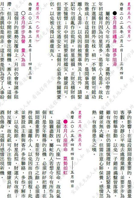 工作量激增,竞争者步步紧逼、属蛇人需保持高度警惕,谨防由于一时疏忽被他人取代、财运方面属于“过路财神”,虽然收入不俗,但各种意外支出也多。