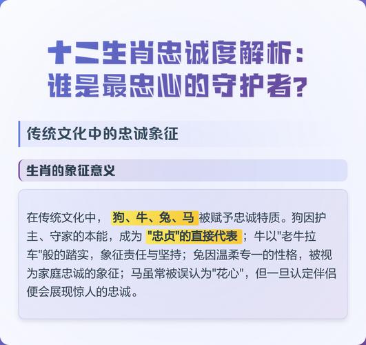 论及忠诚,世人脑海中首先浮现的,多半是“戌狗”、此言不虚,但并非全部、忠诚二字,内涵广博,有对爱情的矢志不渝,有对友情的肝胆相照,亦有对事业的鞠躬尽瘁、若要深究,还需拨开云雾,细看各生肖的天性秉性。