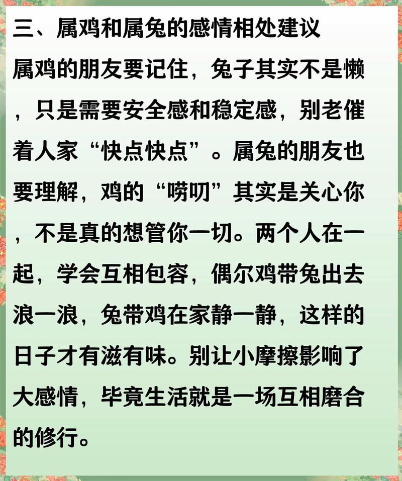 卯兔与酉鸡的结合,是一场修行、它要求属鸡的一方收敛羽翼,学会低头;要求属兔的一方竖起耳朵,学会分辨话语背后的真意、这段婚姻如同一块璞玉,需经历持续的打磨与雕琢,方能褪去棱角,焕发温润和谐的光彩。